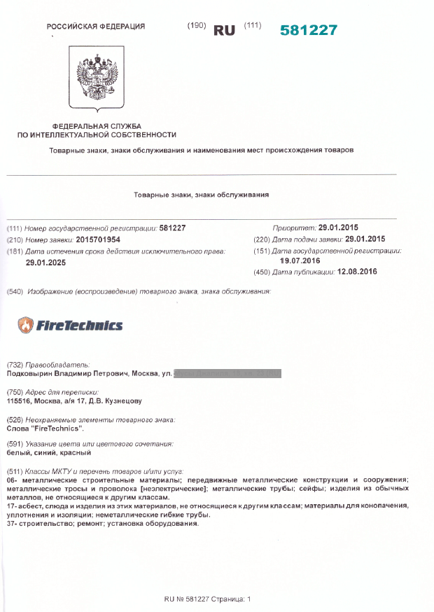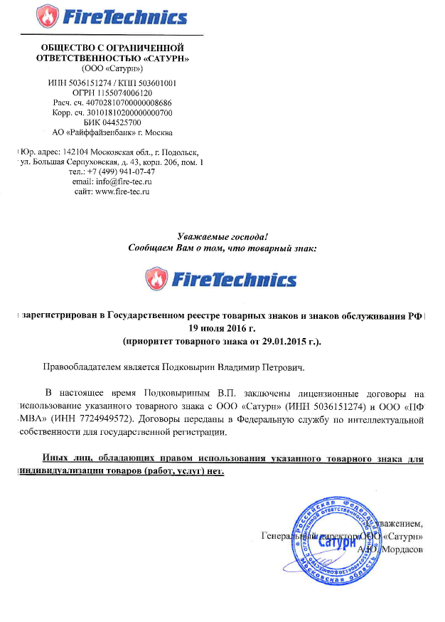 Информация о торговом знаке FireTechnics